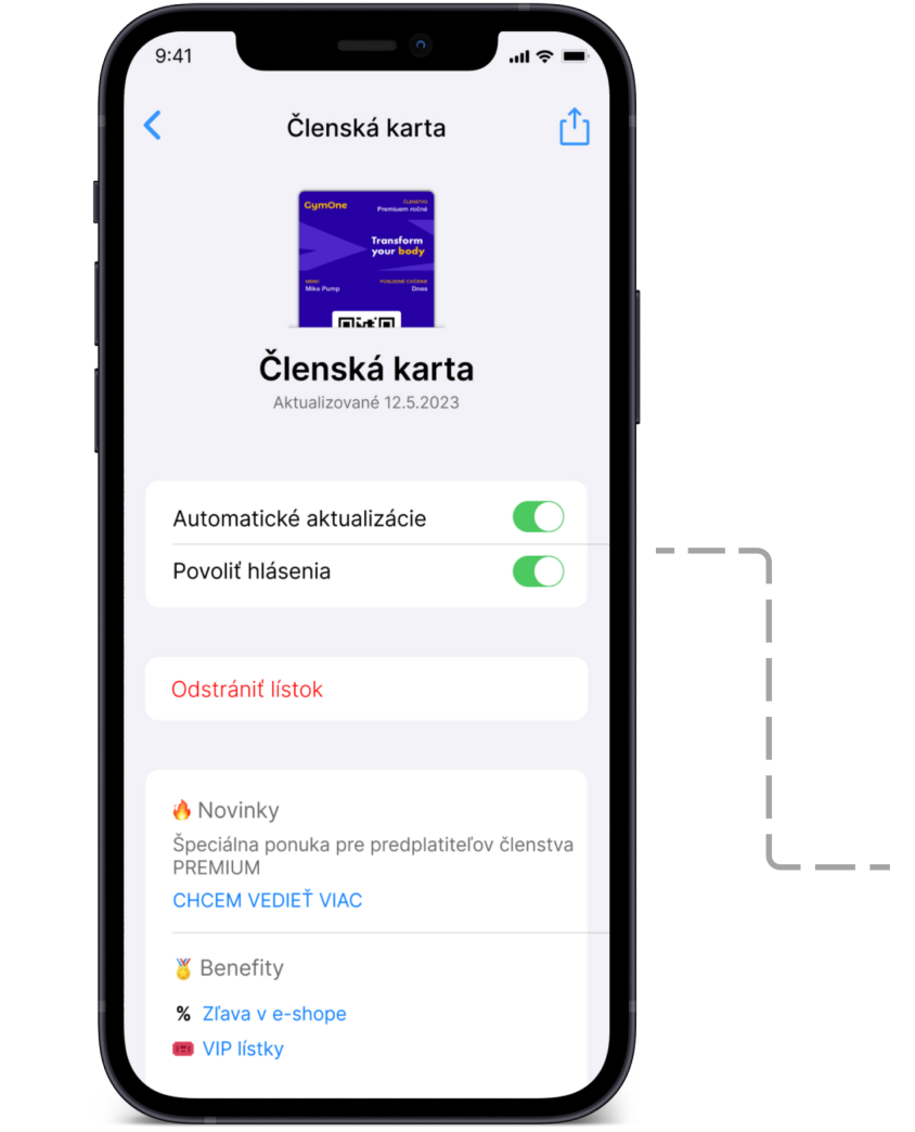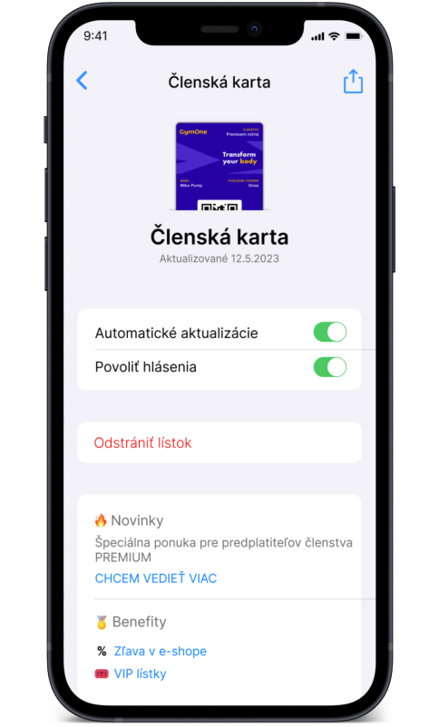 Digitálna karta sa automaticky aktualizuje. Takže vždy keď ju otvoríš, nájdeš aktuálne informácie, aktuálne benefity a všetko dôležité z našej komunity. Kartu vieš aktualizovať aj manuálne potiahnutím dole.